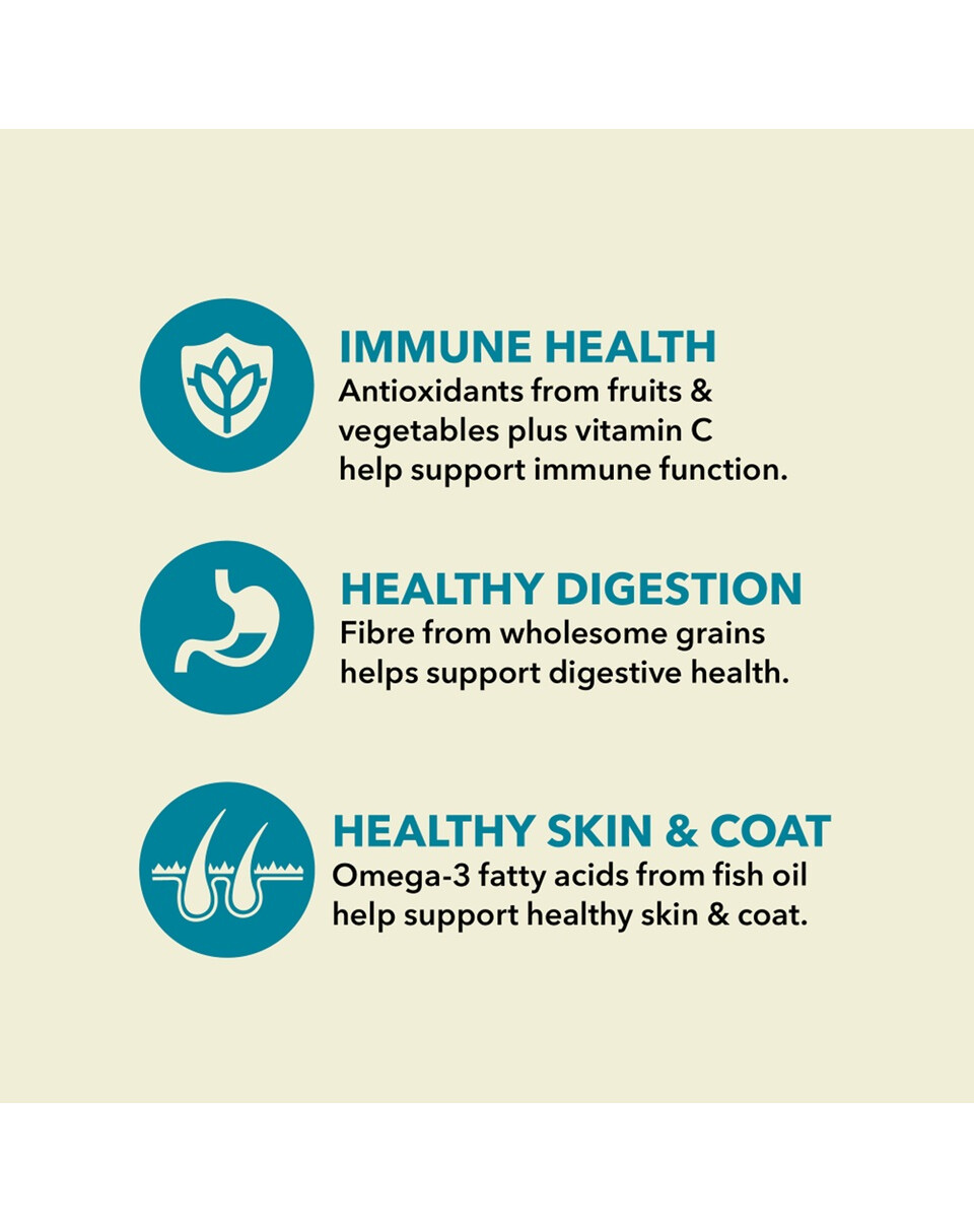 Složení: syrový losos (22 %), sušený sleď (19 %), perlový ječmen, celý hrách, oves bez slupek, vepřové sádlo (8 %), celý oves, cizrnová vláknina, rybí tuk (1 %), uhličitan vápenatý, chlorid draselný, sušené mořské řasy, sůl, sušený kořen čekanky, čerstvá celá dýně, čerstvá celá mošusová dýně, čerstvá celá mrkev, čerstvá celá jablka, čerstvé celé hrušky, čerstvé celé cukety, čerstvá kapusta, čerstvý špenát, čerstvé listy tuřínu, čerstvé listy červené řepy, celé brusinky, celé borůvky, celé saskatoons, kurkuma, bodlák, kořen lopuchu, levandule, kořen kozlíku lékařského, šípky