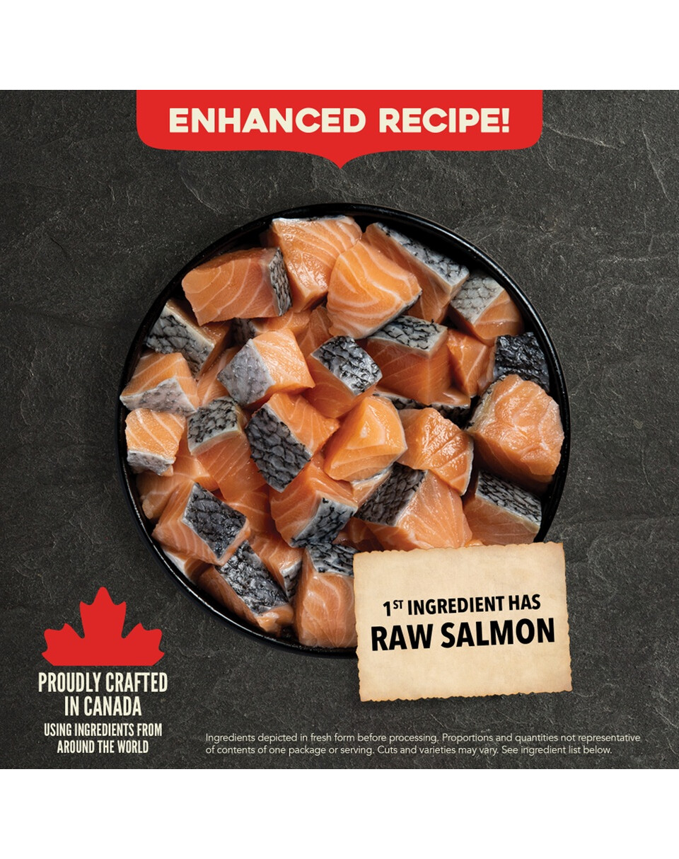 Složení: syrový losos (22 %), sušený sleď (19 %), perlový ječmen, celý hrách, oves bez slupek, vepřové sádlo (8 %), celý oves, cizrnová vláknina, rybí tuk (1 %), uhličitan vápenatý, chlorid draselný, sušené mořské řasy, sůl, sušený kořen čekanky, čerstvá celá dýně, čerstvá celá mošusová dýně, čerstvá celá mrkev, čerstvá celá jablka, čerstvé celé hrušky, čerstvé celé cukety, čerstvá kapusta, čerstvý špenát, čerstvé listy tuřínu, čerstvé listy červené řepy, celé brusinky, celé borůvky, celé saskatoons, kurkuma, bodlák, kořen lopuchu, levandule, kořen kozlíku lékařského, šípky