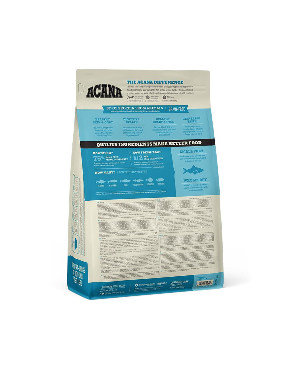 ACANA PACIFICA obsahuje divoce ulovené ryby: sledě, makrely, štikozubce, tresku modravou, platýze a okouníka v poměru celé kořisti, aby odrážely přirozenou stravu. Ingredience jsou dodávány čerstvé nebo syrové z ostrova North Vancouver Island.