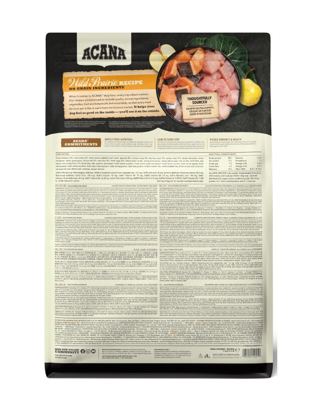 Složení: Čerstvé kuře (13 %), syrové krůtí (9 %), čerstvé kuřecí droby (játra, srdce, žaludky) (8 %), sušené kuřecí maso (8 %), dehydrovaný sleď (7 %), dehydrovaný krůtí maso (7 %), celá červená čočka, celá cizrna, celý zelený hrášek, kuřecí tuk (5 %), syrový pstruh (5 %), čerstvá vejce (5 %), celá zelená čočka, celé fazole pinto, celý žlutý hrášek, rybí olej (2 %), čočková vláknina, hrachový škrob, syrová krůtí játra (1 %), sušená mořská řasa, sůl, droždí (S. cerevisiae), čerstvá celá dýně, čerstvá celá dýně hokkaido, čerstvá celá mrkev, čerstvá celá jablka, čerstvé celé hrušky, čerstvá celá cuketa, čerstvá kapusta kadeřávek, čerstvý špenát, čerstvé listy tuřínu, čerstvá červená řepa, celé brusinky, celé borůvky, sušený kořen čekanky, kurkuma, kořen sarsaparilly, kořen proskurníku, plody šípků, jalovcové bobule.