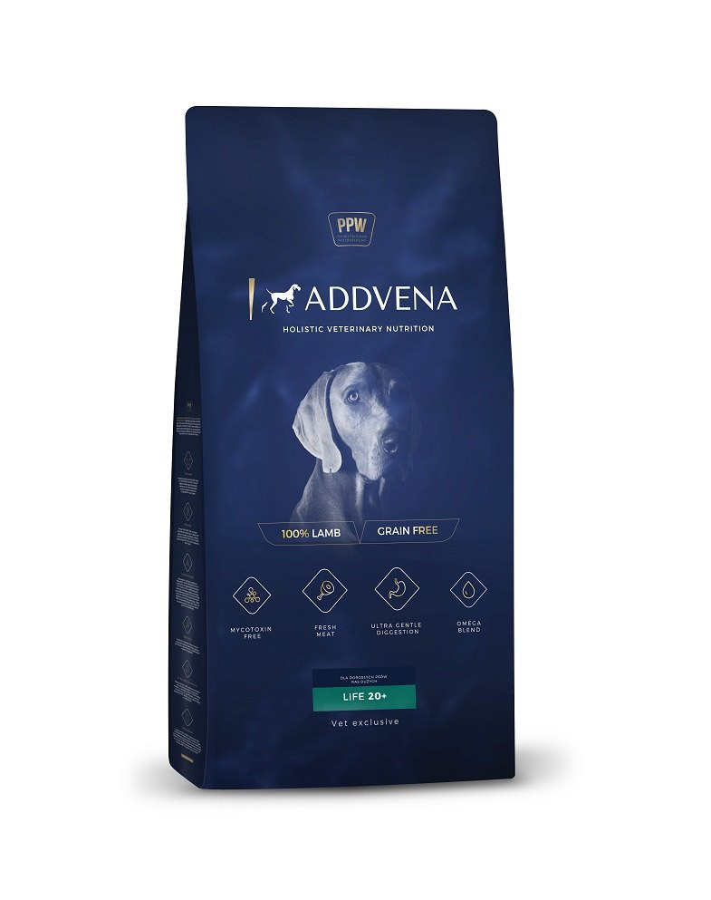 ADDVENA LIFE 20+ je vysoce chutné, plnohodnotné krmivo bez obilovin na bázi čerstvého jehněčího masa, určené speciálně pro dospělé psy s hmotností nad 20 kg. Obsahuje bílkoviny živočišného původu (jehněčí), což z něj činí výrobek vhodný zejména pro psy s potravinovými alergiemi a dokonce i pro psy s alergií na jiné bílkoviny než jehněčí nebo hovězí. Krmivo ADDVENA LIFE 20+ se doporučuje podávat psům ve věku od 12 měsíců do 7 let.