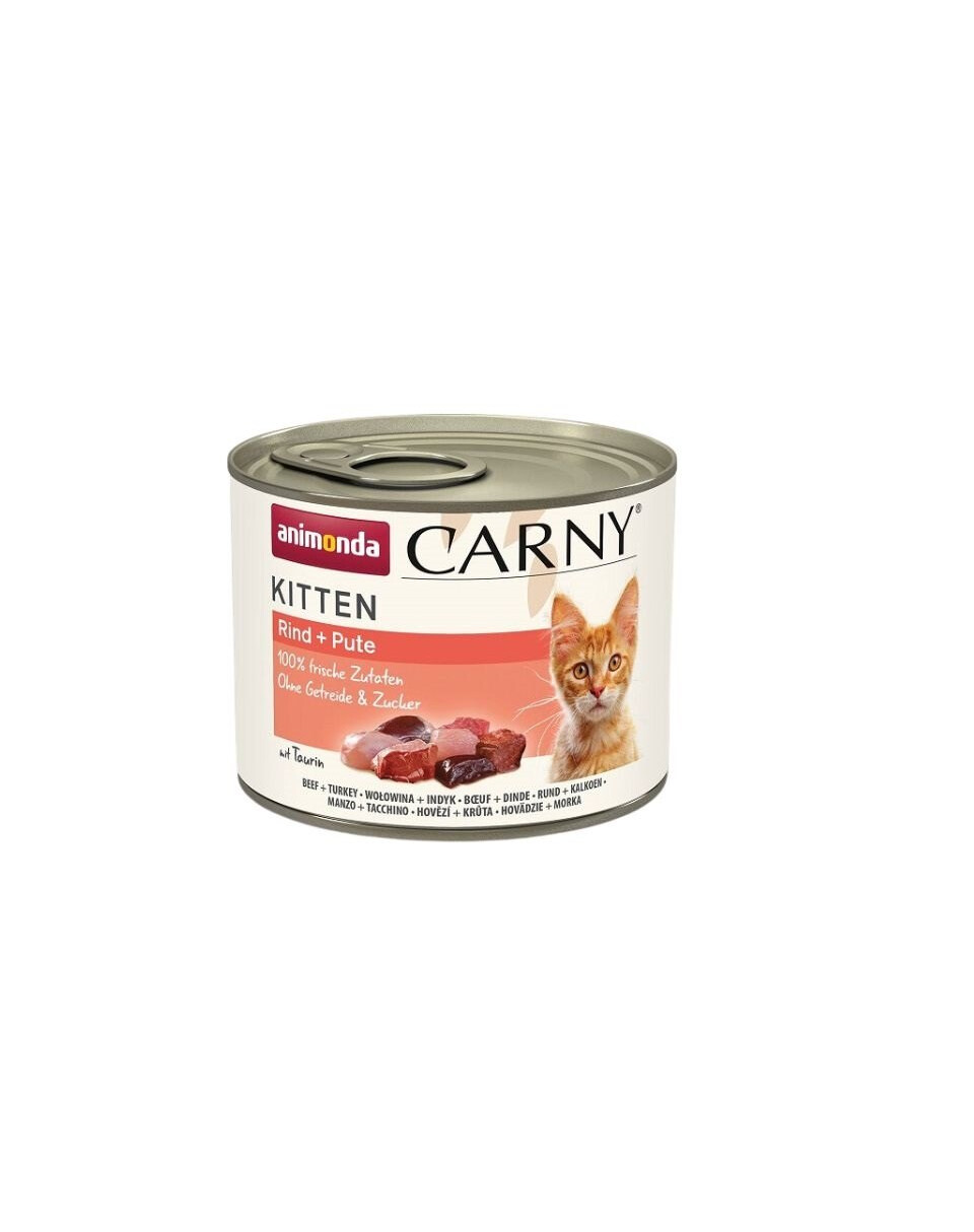 Konzerva pro koťat s hovězím a krůtím masem.