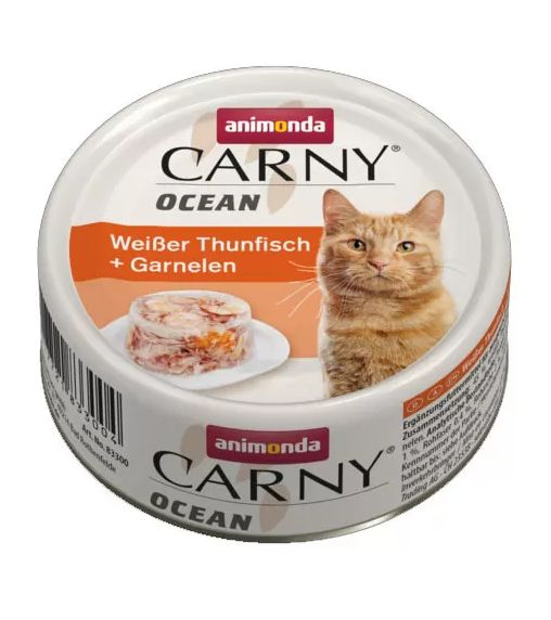 Kompletní konzerva pro kočky s tuňákem a krevetami.