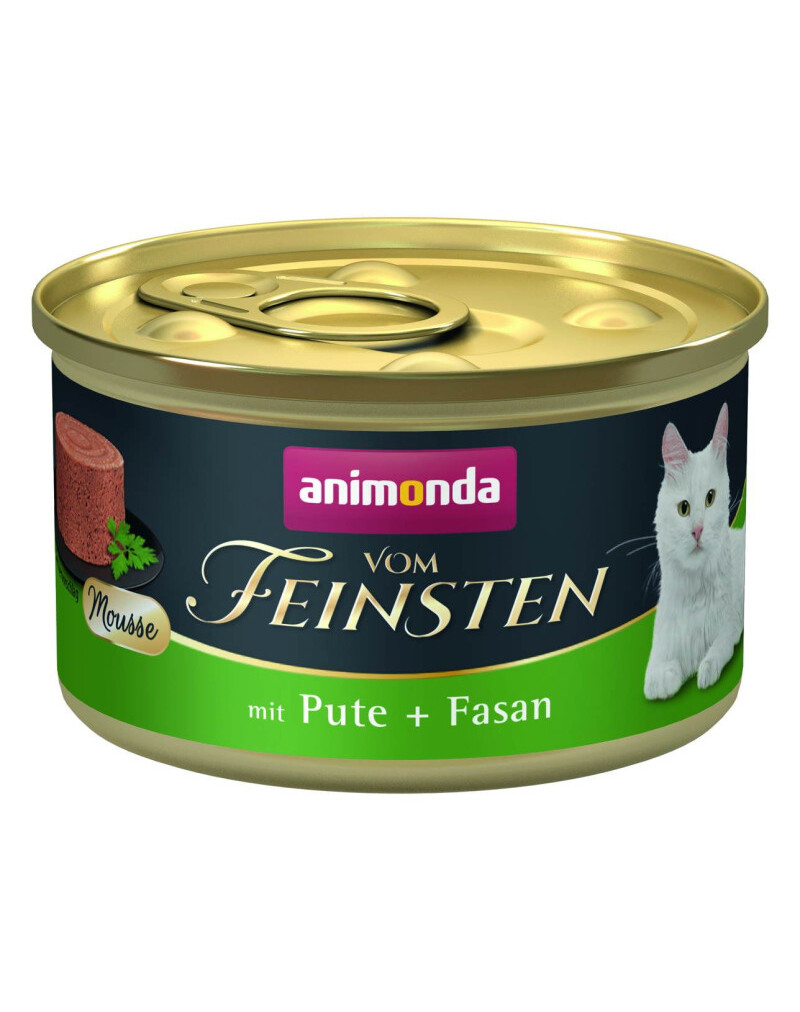 Vom Feinsten Mousse s krůtím masem a bažantem je kompletní, jemné krmivo ve formě paštiky určené pro dospělé kočky ve věku od 1 do 6 let. Receptura zajišťuje vyváženou výživu a výjimečnou chuť, kterou ocení i ty nejnáročnější kočky.