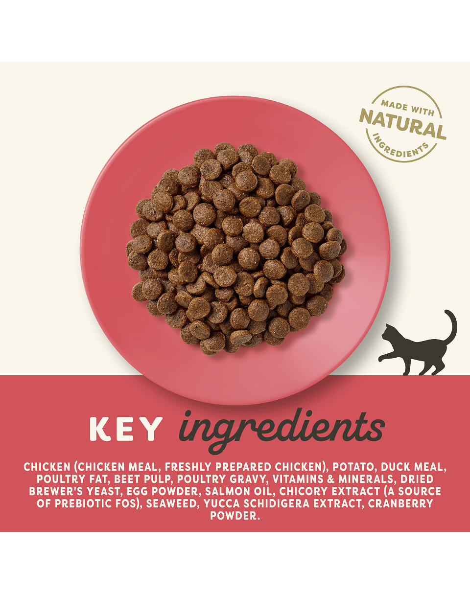 Kuřecí moučka (47 %), kachní moučka (21 %), čerstvě mleté drůbeží maso (16 %), brambory, řepné řízky, pivovarské kvasnice, drůbeží omáčka (1 %), lososový olej, vitamíny a minerální látky, sušená vejce, rostlinná celulózová vláknina (0,03 %), chlorid sodný, uhličitan vápenatý, mořské řasy, brusinky, dl-methionin, chlorid draselný, extrakt z juky, extrakt z citrusových plodů, extrakt z rozmarýnu.