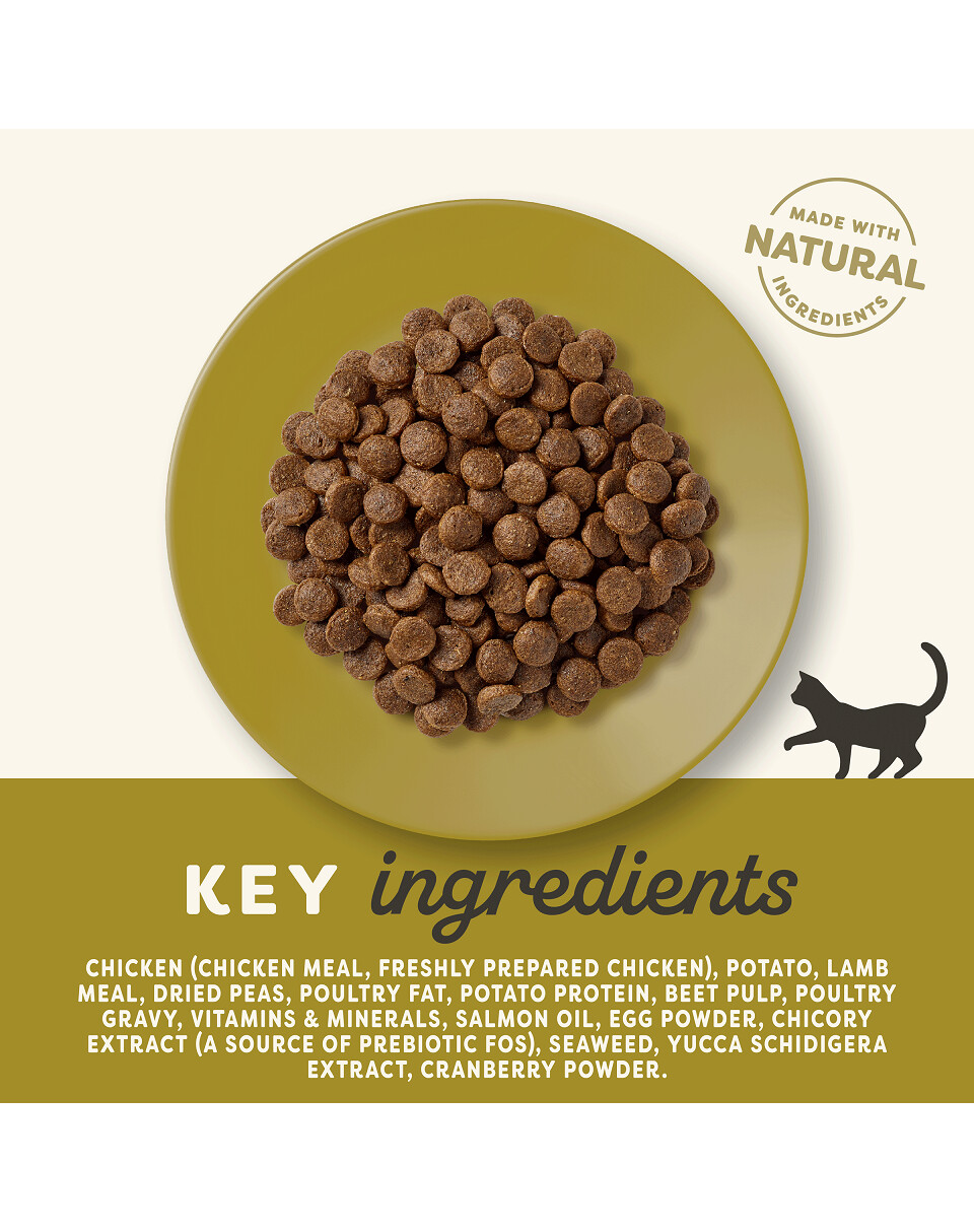 Složení: Sušené kuřecí 48%, sušené jehněčí 20%, sušené brambory, vykostěné mleté kuřecí 12%, řepná drť, šťáva z kuřete, lososový olej (zdroj omega-3, EPA a DHA), vitamíny, minerály, sušené vejce, rostlinná vláknina 0,03%, chlorid sodný, uhličitan vápenatý, mořské řasy / čepelatka, brusinky, DL - methionin (kyselina máselná - chrání játra a přirozeně zvyšuje kyselost moči), chlorid draselný, výtažek z juky, výtažek z citrusů, výtažek z rozmarýnu.