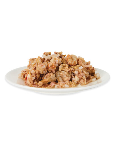 Složení: filet z tuňáka 52 %, krevety 23 %, rýže 1 %, rybí vývar 24 %. Bez přídatných látek.