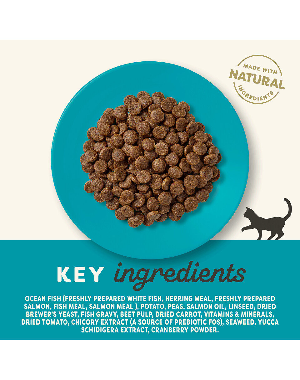 Složení : Čerstvá bílá ryba – síh (18%), hrášek, sleďová moučka (12%), cizrnová mouka, čočka, čerstvý losos (8%), bílá rybí moučka (5%), lněné semínko, pivovarské kvasnice, lososový olej (3%), tolice vojtěška, lososová moučka (2,5%), hydrolyzovaná rybí bílkovina (2,5%), sušené brusinky, vitamíny a minerály, kokosový olej, sušená jablka, sušené hrušky, inulin, sušená rajčata, sušený špenát, výtažek z citrusů, výtažek z rozmarýnu, výtažek z juky.
