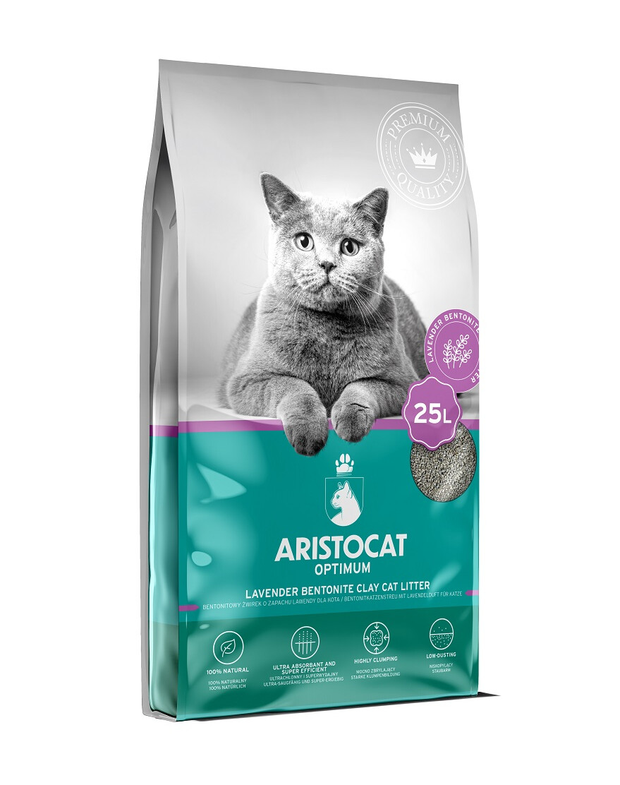 Vonné složení použitého steliva Aristocat Optimum zanechává v prostředí steliva příjemnou a svěží levandulovou vůni. Bentonitový jíl je šetrný k tlapkám koťat, vůně povzbuzuje k používání steliva i kočky, které dosud nebyly naučeny čistotnosti.