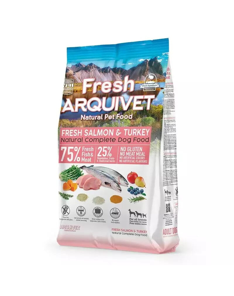 Karma Arquivet, která je polosladká a neobsahuje lepek, masovou moučku, umělá barviva ani aromata. Kromě toho Arquivet fresh salmon poskytuje vašemu mazlíčkovi jedinečný zážitek z vaření díky vynikající chuti krůtího masa a lososa. Každé sousto poskytne vašemu mazlíčkovi explozi skutečných, přírodních chutí. Toto krmivo je bohaté na živiny a chutné a splňuje všechny potřeby vašeho psa.