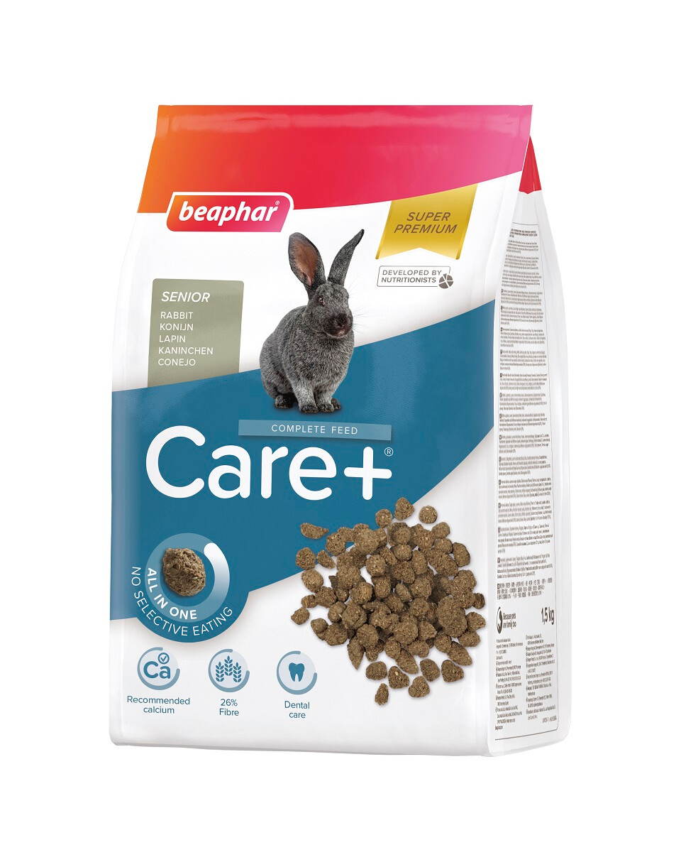 Care+ Senior Rabbit je mimořádně chutné, superprémiové krmivo. Jeho receptura byla vyvinuta ve spolupráci s veterináři a odborníky na výživu. Care+ se vyrábí extruzním procesem, a proto má každá granule identické složení (vše v jednom). Díky tomu nevznikají žádné zbytky a chovatelé si mohou být jisti, že byly zkonzumovány všechny složky nezbytné pro zdraví - tím se zcela eliminuje fenomén selektivního pojídání chutnějších složek krmiva. Tvrdost granulí podporuje správné obrušování zubů. Teplota dosažená při výrobě zlepšuje stravitelnost bílkovin. Pelety se vyznačují nízkým obsahem vápníku, vyváženým obsahem důležitých polynenasycených mastných kyselin Omega 6 a Omega 3 (pocházejících z pšenice, sóji a lněného semínka), přiměřeným obsahem vlákniny a přídavkem aromatického extraktu z timothy. Důležitou antioxidační funkci plní vitamin C, vitamin E a extrakt ze zeleného čaje a ženšenu, čímž podporují přirozenou obranyschopnost králíka. Krmivo Care+ Senior Rabbit má nízký obsah bílkovin a neobsahuje přidaný cukr, aby se u těchto méně aktivních králíků předešlo obezitě. Care+ Senior Rabbit je dokonale vyvážené krmivo pro starší králíky, které splňuje všechny jejich přirozené nutriční potřeby.