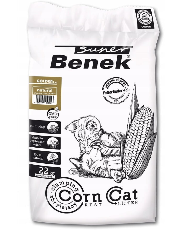 Jedná se o hrudkující kukuřičnou podestýlku v řadě podestýlky Super Benek Corn. Vyznačuje se charakteristickým vzhledem válečků, jejichž pravidelný tvar a hladký povrch účinně omezují jejich vynášení mimo stelivo. Granulát si zachovává vlastnosti řady kukuřičné drti, vyznačující se vysokou absorpcí, účinností a účinností při pohlcování nepříjemných pachů. Stelivo vyrobené ze 100% přírodní obnovitelné suroviny je biologicky rozložitelné. Shluknuté hrudky steliva jsou pevně svázány a nedrolí se, když je odstraníte lopatkou z WC. Inovativní technologie uzavření nepříjemných pachů do hrudky zaručuje svěžest a účinné ošetření charakteristického zápachu kočičí moči. Kočkolit Benek Corn je šetrný k vám, vašemu mazlíčkovi i životnímu prostředí!