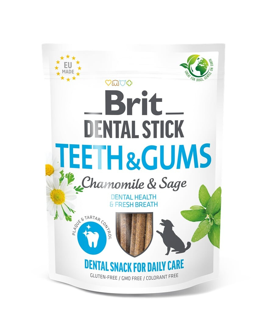 Brit Dental Stick Teeth & Gums je chutná dentální pochoutka, která podporuje zdraví zubů a dásní dospělých psů. Díky speciální struktuře pomáhá při přirozeném čištění zubů, a přídavek SHMP omezuje usazování zubního kamene.