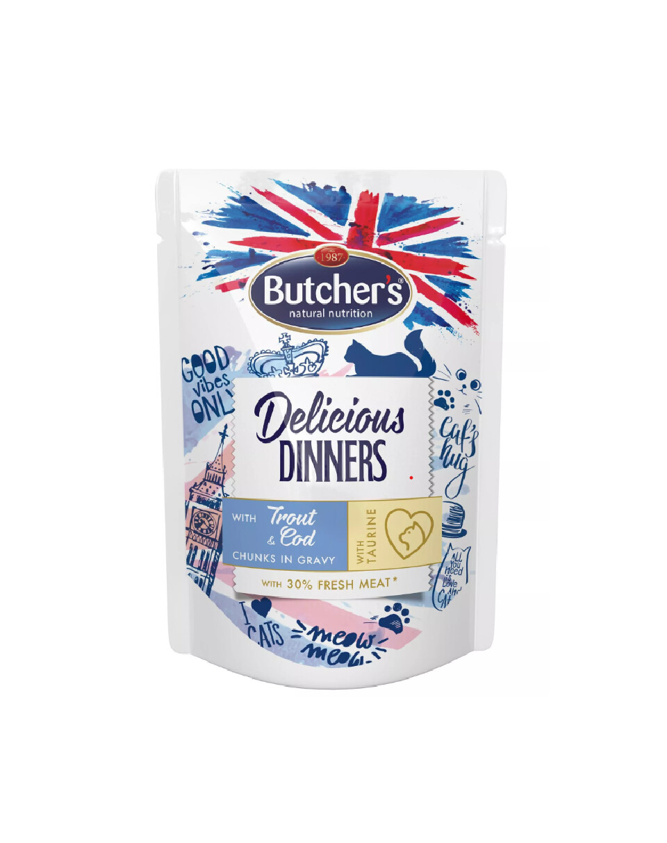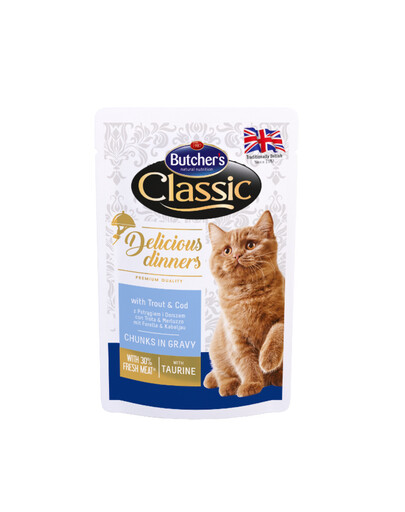 Kapsička Classic Delicious Dinners s pstruhem je vynikající potravou, která poskytuje vaší kočce potřebné vitamíny a minerály. Recept byl obohacen Taurinem o zdravé srdce. Kapsičky jsou připravené z čerstvého masa, přírodních ingrediencí, bez umělých konzervačních látek, cukrů, barviv a jsou bez lepku. Obsahují vysoký obsah masa a derivátů s čerstvým masem a vitamíny pro zdraví kočky.