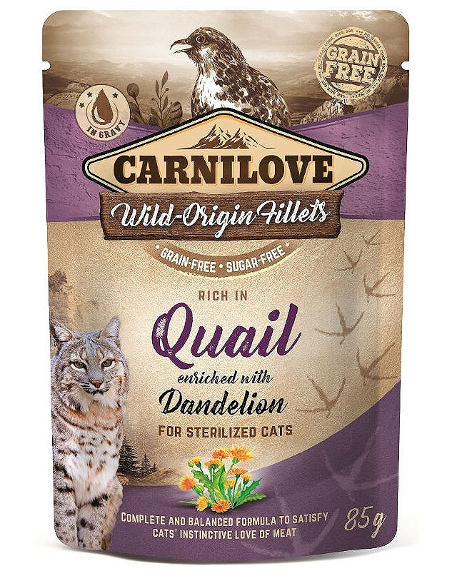 Kompletní vlhké krmivo bez obilovin s křepelkou a pampeliškou pro dospělé kočky po sterilizaci.