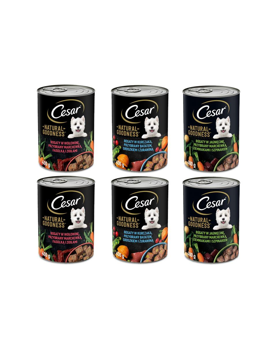 Vlhké krmivo Cesar® Natural Goodness bohaté na jehněčí maso je kompletní krmivo pro dospělé psy vyrobené z přírodních surovin. Bylo připraveno podle pečlivě vybrané receptury, na jejímž vývoji se podíleli odborníci na výživu a veterináři z WALTHAM™ Animal Science Institute. Toto krmivo lze podávat v kombinaci se suchým krmivem nebo jako samostatnou lahodnou stravu. Cesar® Natural Goodness Rich in Lamb obsahuje nejen maso a živočišné produkty, ale také lahodnou zeleninu a bylinky.