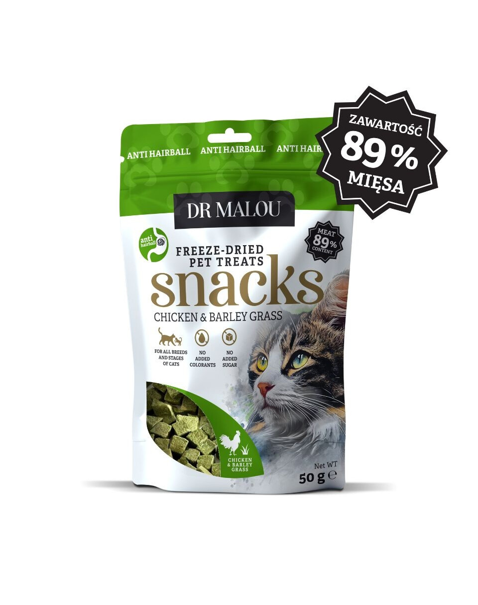 Doplňkové krmivo pro kočky – 100% lyofilizované kostičky s kuřecím masem a ječmennou trávou Dr Malou