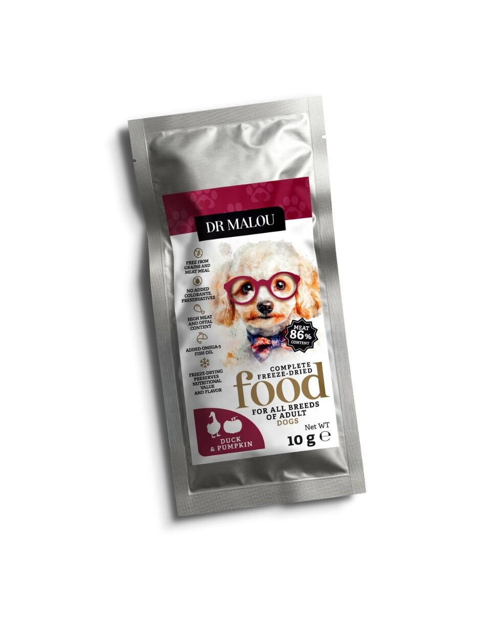 Lyofilizované kompletní krmivo Dr Malou Kachna s Dýní je alternativou k standardnímu krmení, určené majitelům, kteří chtějí svému psu nabídnout přirozenou stravu, bez obilovin, umělých přísad a barviv. Díky inovativnímu procesu lyofilizace krmivo zachovává plné spektrum výživových hodnot a jedinečnou, přirozenou chuť čerstvých ingrediencí.