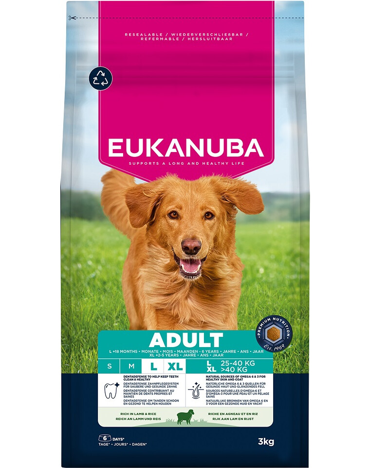 Toto krmiva EUKANUBA pro dospělé psy, bohaté na jehněčí a rýži, je 100% kompletní a vyvážené a ideální pro velké plemena ve věku od 18 měsíců do 6 let (nebo 2–5 let v případě obřích plemen).