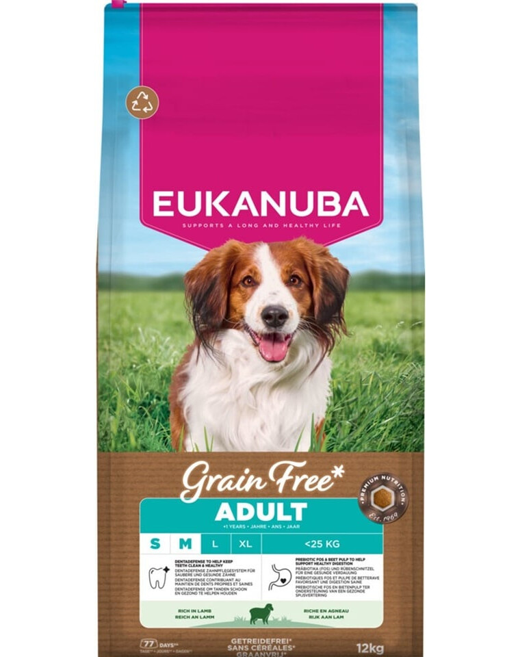 EUKANUBA Grain Free Adult Small & Medium Lamb je kompletní, bezobilná suchá krmiva určená pro dospělé psy malých a středních plemen starší než 1 rok. Receptura s nízkým obsahem alergenů byla vyvinuta s ohledem na psy s citlivým trávicím systémem a sklony k intoleranci na obiloviny, podporující jejich každodenní kondici a pohodu.