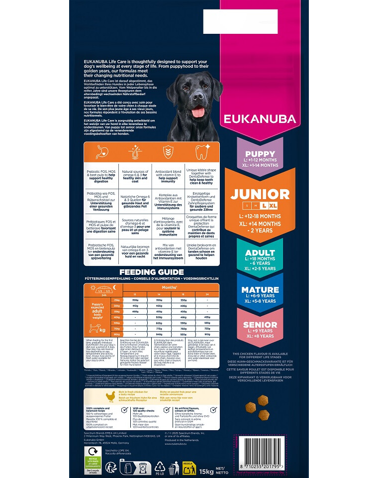 EUKANUBA Life Care je prémiová řada krmiv vědecky vyvinutá tak, aby plně uspokojovala měnící se potřeby psího těla v každé fázi jeho života. Tato receptura je speciálně navržena pro mladé psy velkých plemen ve věku 12–18 měsíců (nebo 14 měsíců až 2 roky u obřích plemen), což je období, kdy stále probíhá vývoj kostry a svalstva a pes pomalu přechází do dospělosti.