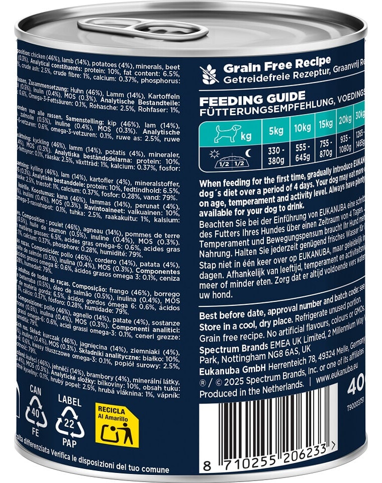 Složení: kuřecí (46%), jehněčí (14%), brambory (4%), minerály, řepná dužina (0.5%), lososový olej (0.5%), inulin (0.4%), MOS (0.3%).