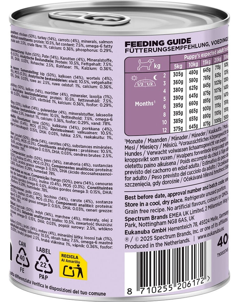 EUKANUBA Puppy je kompletní, vyvážené mokré krmivo vytvořené pro štěňata všech plemen ve věku od 1 do 12 měsíců. Poskytuje všechny nezbytné živiny potřebné pro správný růst, vývoj svalů a zdraví mladých psů.