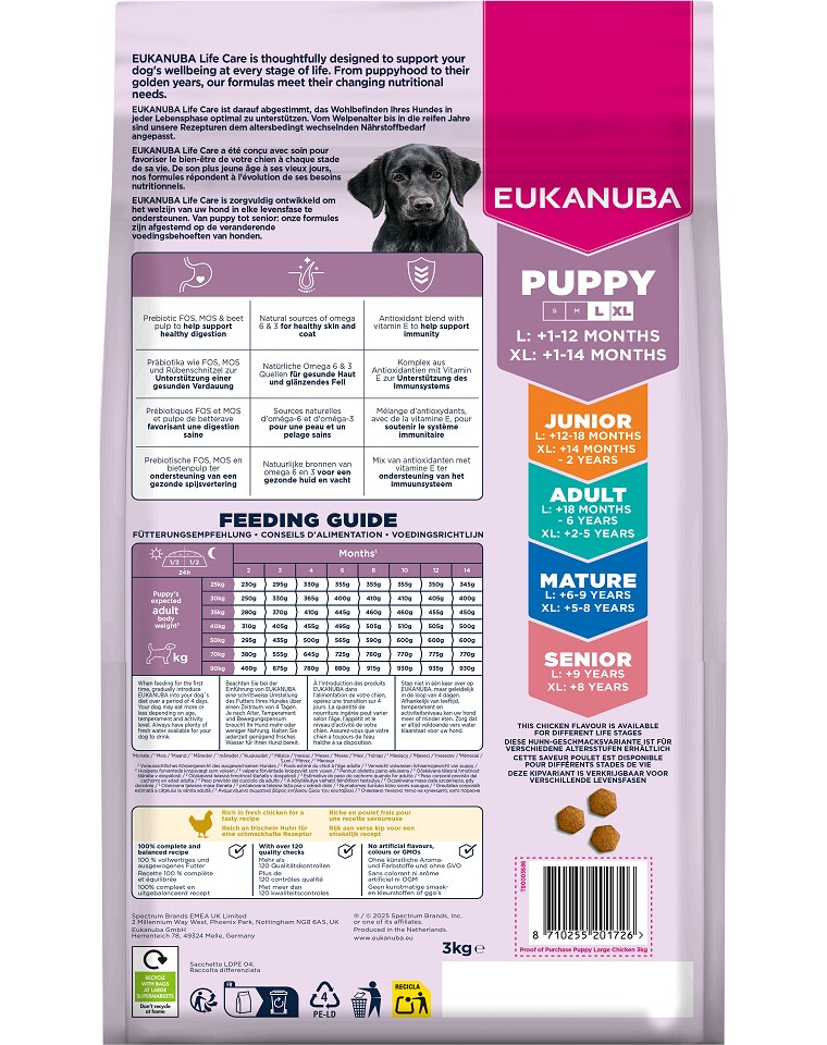 Tato suchá krmiva EUKANUBA byla vyvinuta s ohledem na štěňata velkých plemen ve věku 1–12 měsíců a obřích plemen do 14. měsíce života. Její složení vychází z čerstvého kuřete, které představuje vysoce kvalitní zdroj bílkovin, podporující správný vývoj svalů a celkovou kondici organismu.
