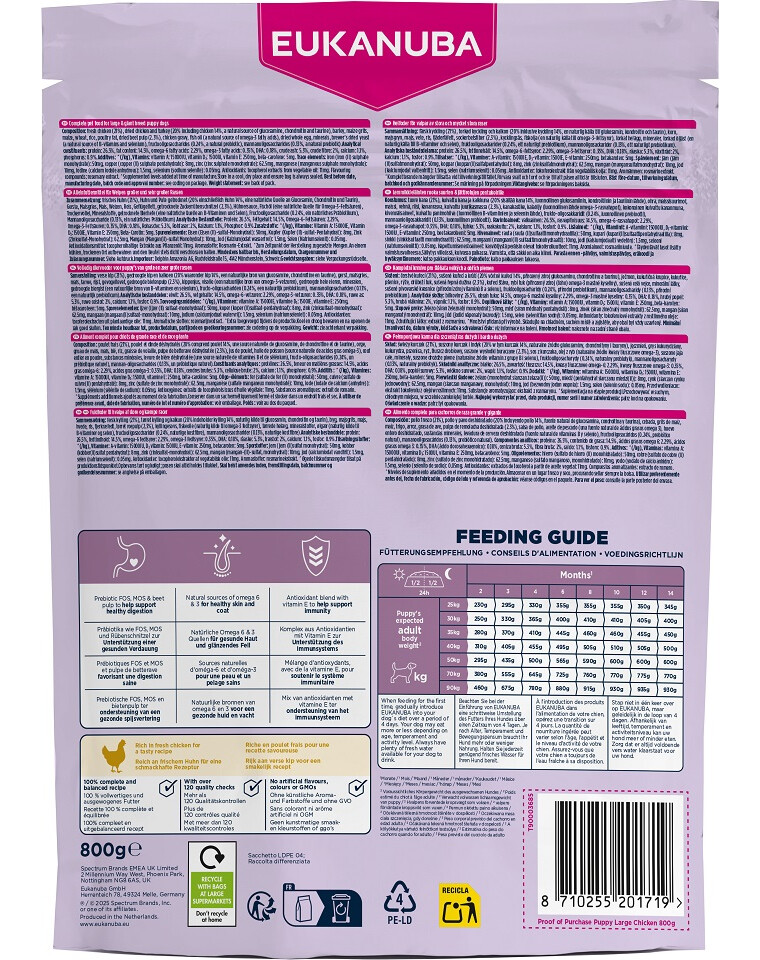 Tato suchá krmiva EUKANUBA pro štěňata, bohatá na čerstvé kuře, je 100% kompletní a vyvážená a ideální pro velká plemena ve věku 1–12 měsíců (nebo 1–14 měsíců v případě obřích plemen).Bohatá na čerstvé kuře, poskytuje nezbytné bílkoviny pro budování silných svalů. Receptura obsahuje DHA podporující vývoj mozku a schopnost učení, stejně jako vápník pro silné kosti a zdravý skelet. Díky obsahu omega-3 a omega-6 kyselin krmivo podporuje zdravou kůži a lesklou srst, poskytující komplexní výživu v klíčovém období růstu.Pečlivě vybraná směs vláken obsahující prebiotika FOS, MOS a řepnou dřeň podporuje správné trávení, a přírodní zdroje omega-6 a omega-3 kyselin posilují zdraví kůže a lesk srsti. Toto suché krmivo poskytuje pokročilou výživu štěňat velkých plemen, podporující optimální kondici těla a dobrý pocit po celý život.