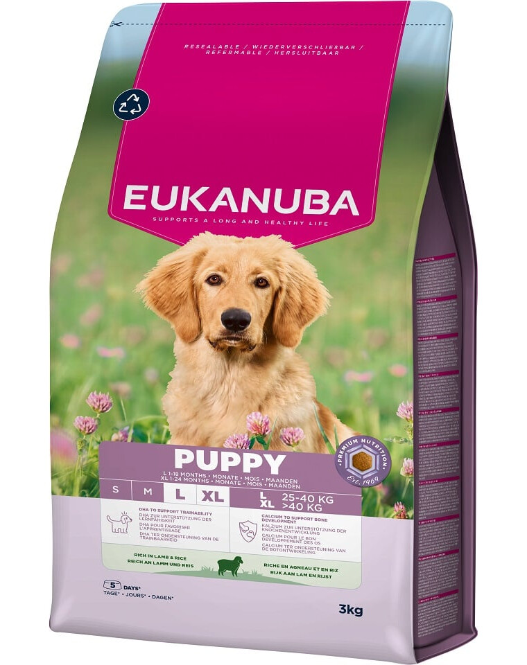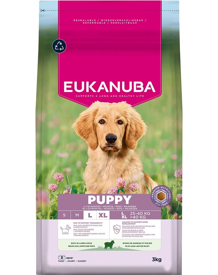Krmivo EUKANUBA pro štěňata, bohaté na jehněčí a rýži, je 100% kompletní a vyvážené a ideální pro velké plemena ve věku 1–18 měsíců (až do 24 měsíců u obřích plemen).