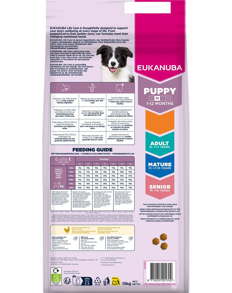 Krmiva EUKANUBA Life Care je prémiový produkt, vytvořený na základě vědeckého výzkumu, aby odpovídal měnícím se potřebám psa v každé fázi vývoje. Verze Puppy Medium Breeds byla vyvinuta speciálně pro štěňata středních plemen ve věku od 1 do 12 měsíců.