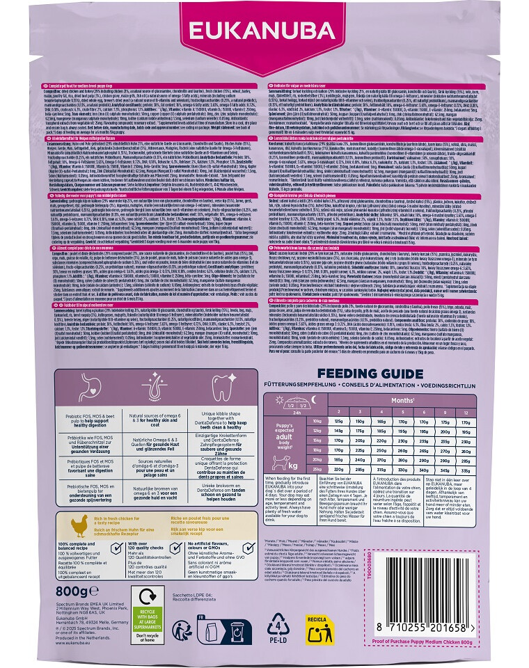 Tato suchá krmiva EUKANUBA byla vytvořena s ohledem na štěňata středních plemen ve věku od 1 do 12 měsíců. Její základ tvoří čerstvé kuře, které je zdrojem plnohodnotného bílkovina podporujícího vývoj silných svalů a správnou kondici mladého psa.