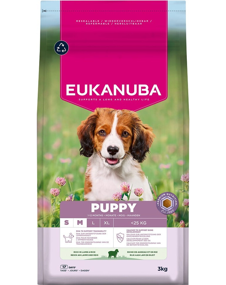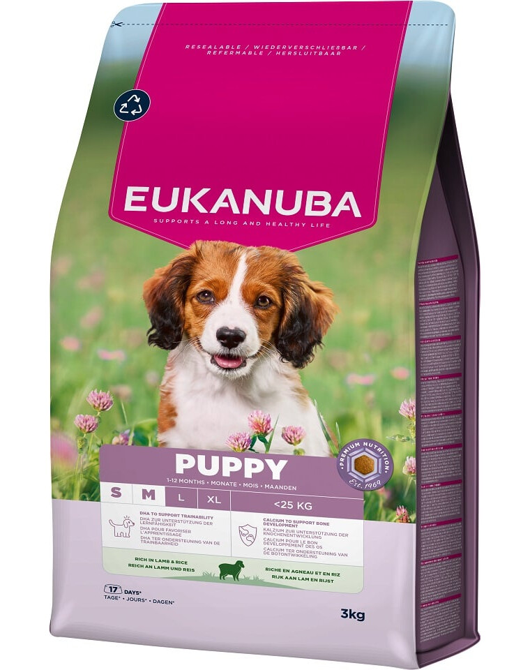 EUKANUBA pro štěňata, bohatá na jehněčí a rýži, je 100% kompletní a vyvážená a ideální pro psy malých a středních plemen ve věku 1–12 měsíců.