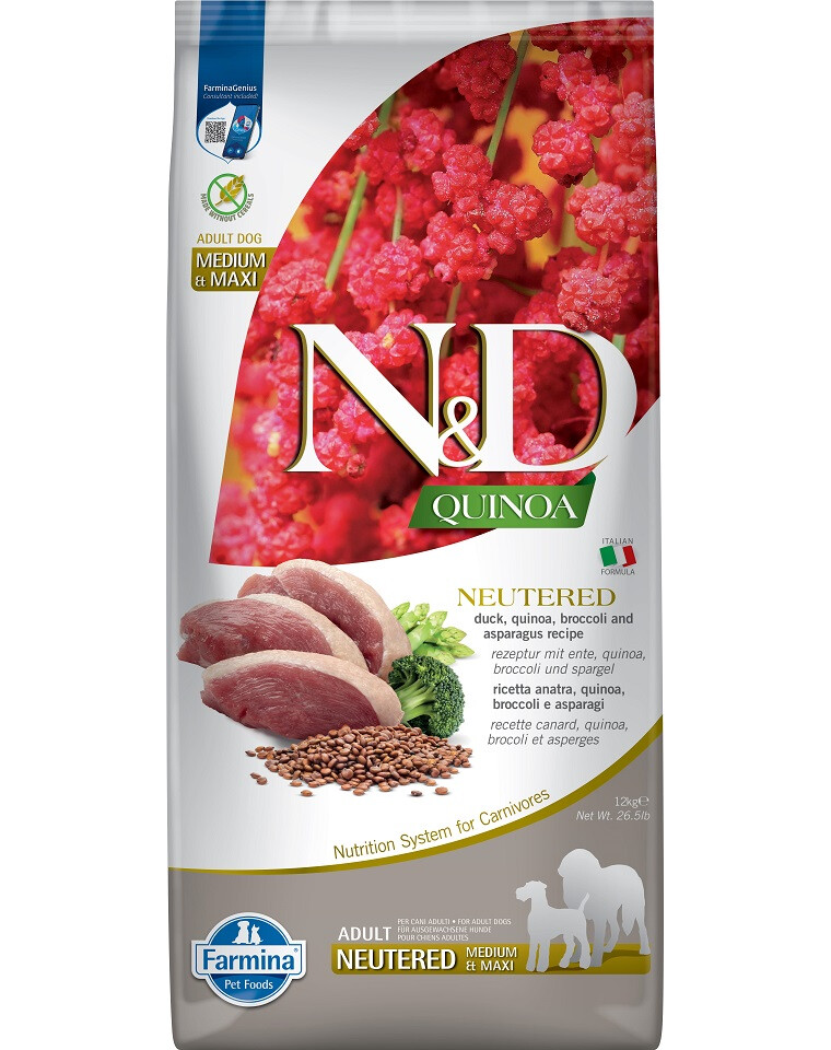 Bezlepkové granule pro kastrované psy středních a velkých plemen s kachnou a brokolici.