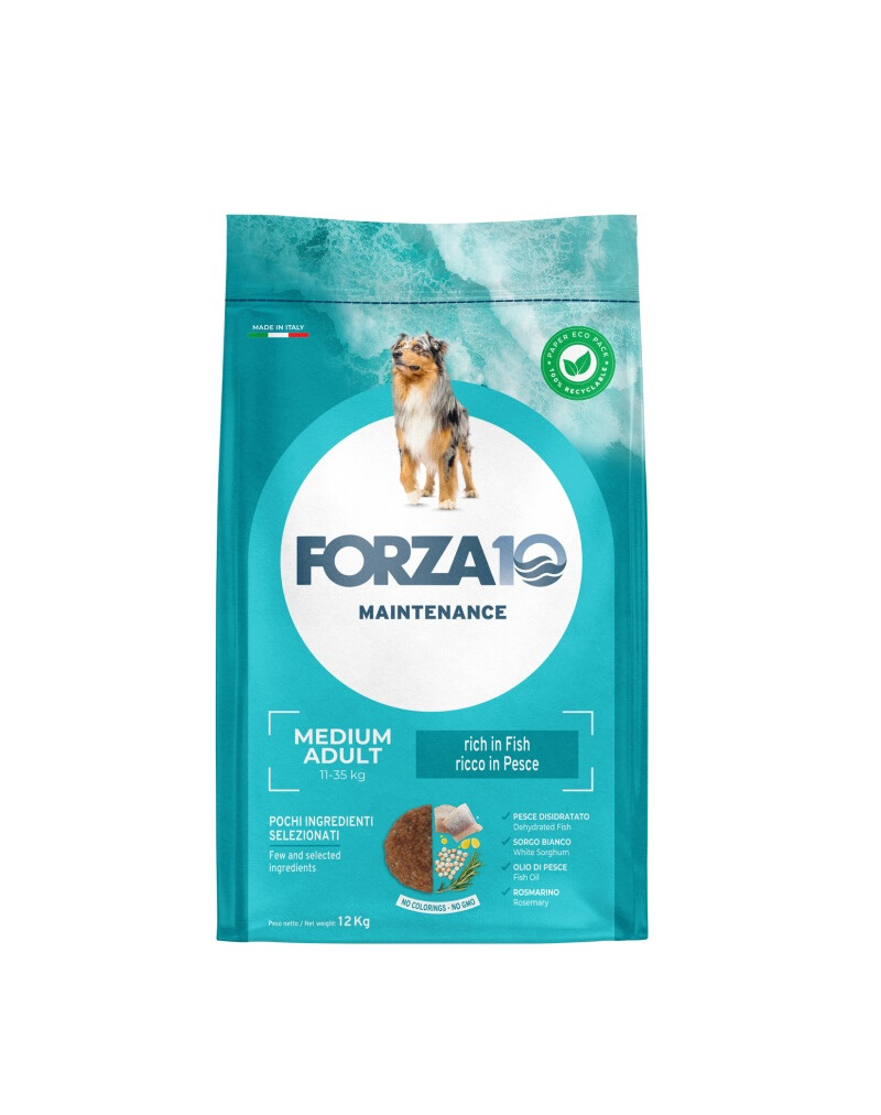 Forza10 Medium Maintenance Fish je základní rybí krmivo pro psy středních plemen, jehož složení zajišťuje optimální zdraví vašeho psa. Obsahuje jediný zdroj čistých bílkovin (oceánské ryby) a čistý zdroj sacharidů (kukuřice, bílý čirok, rýže) pro snížení rizika vzniku potravinových alergií. Doporučeno pro psy s nesnášenlivostí intenzivně chovaného masa.