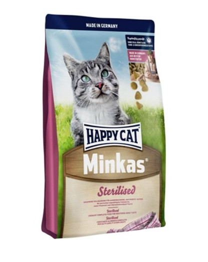 Krmivo Happy Cat Minkas Sterilised je plnohodnotné základní krmivo pro všechny dospělé kastrované kočky. Má snížený obsah tuku a zvýšený podíl hrubé vlákniny. Jakostné živočišní proteiny, absence sóje a jiných rostlinných bílkovinných extraktů a vysoce kvalitní obilné suroviny dodávají tomuto produktu nejlepší stravitelnost a velmi dobrý příjem.