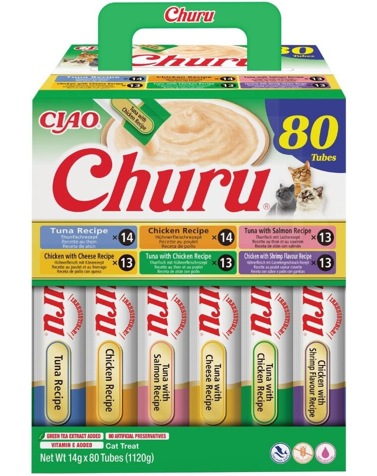 V balení se nachází 80 tubek Churu, v šesti příchutích: