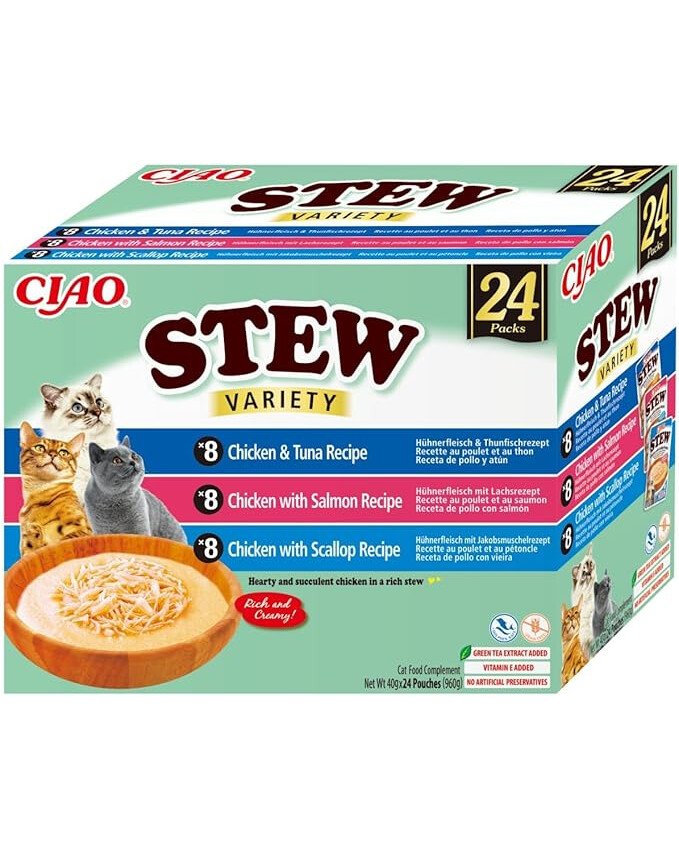 INABA Ciao Stew Creamy Variety je prémiové doplňkové krmivo pro kočky, které spojuje jemné maso s výjimečně krémovým, aromatickým základem. V větším balení 24×40 g najdete rozmanité chutě – kuřecí, rybí a hřebenatky – všechny v sametové, krémové omáčce.