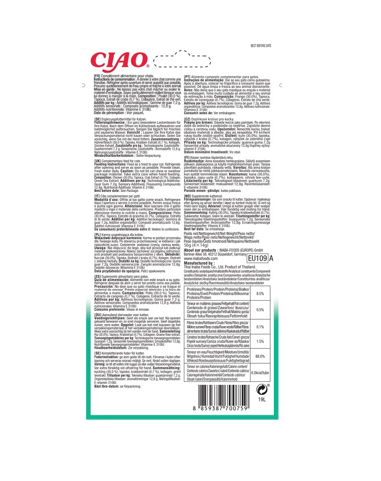 Krémový pamlsek pro kočky s kuřetem a krabem.