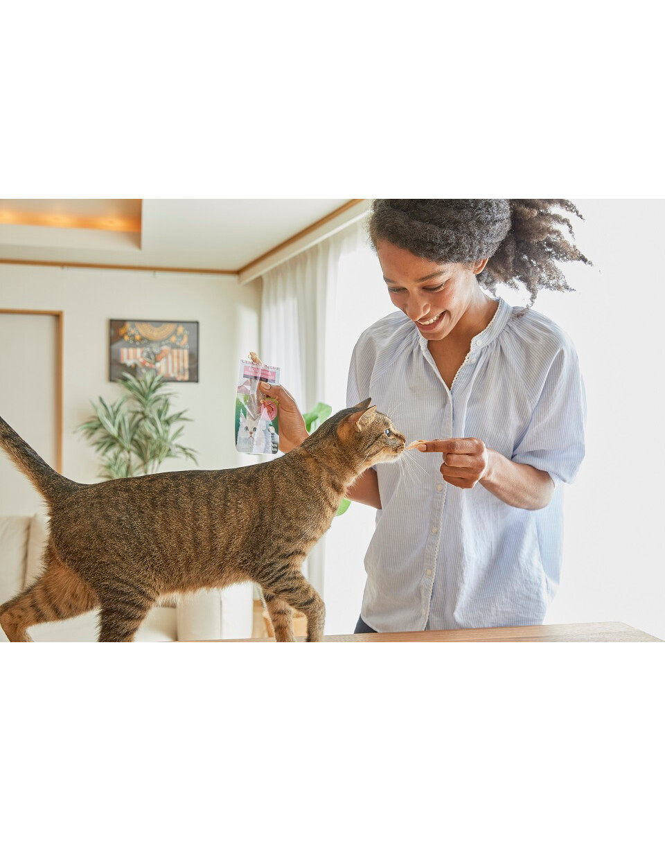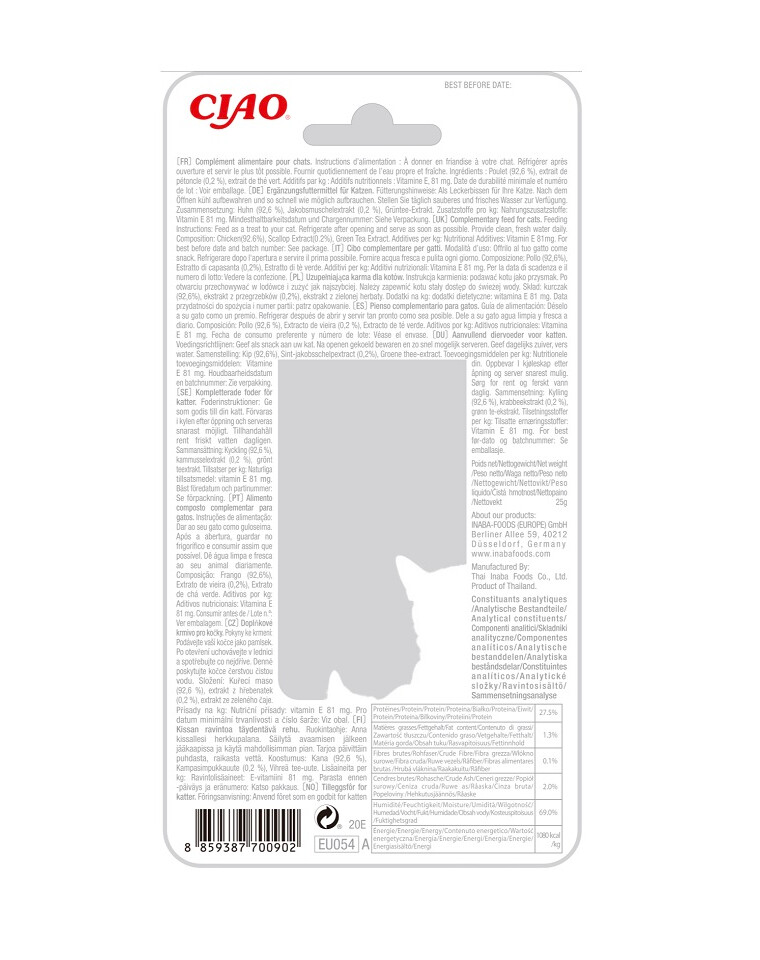 Pamlsek pro kočky ve formě kuřecího filé ve vývaru z mušlí.