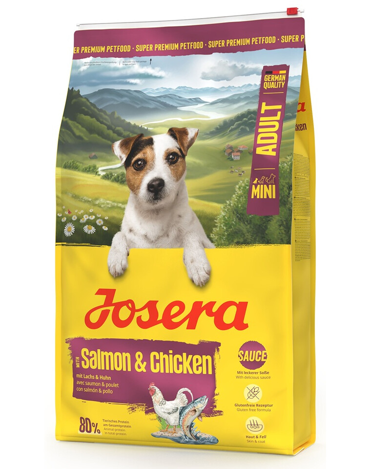 JOSERA Mini Adult Salmon & Chicken – bezglutenové krmivo s omáčkou pro dospělé psy malých plemen.