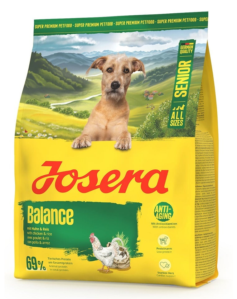 JOSERA Senior Balance je kompletní, nízkotučné a nízkobílkovinné suché krmivo s kuřecím masem a rýží pro starší psy s nižšími energetickými potřebami