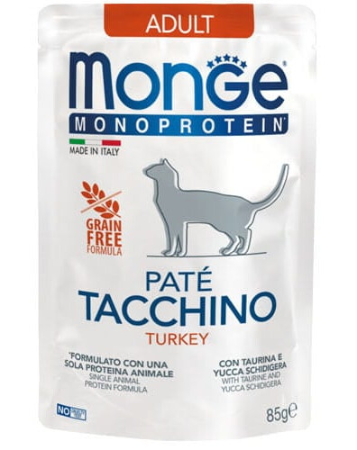 MONGE Monoprotein Adult Cat Paté Turkey je kompletní, vyvážené krmivo pro dospělé kočky, patřící do unikátní řady Monge Monoprotein Superpremium. Receptura je založena na jednom zdroji živočišného bílkoviny – krůtě, která se vyznačuje vysokou stravitelností a vynikající vstřebatelností.