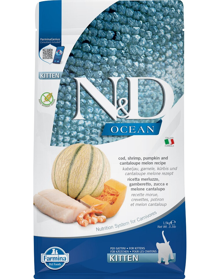 Granule pro koťata a březí a kojící kočky s treskou, krevetami, dýní a melounem.