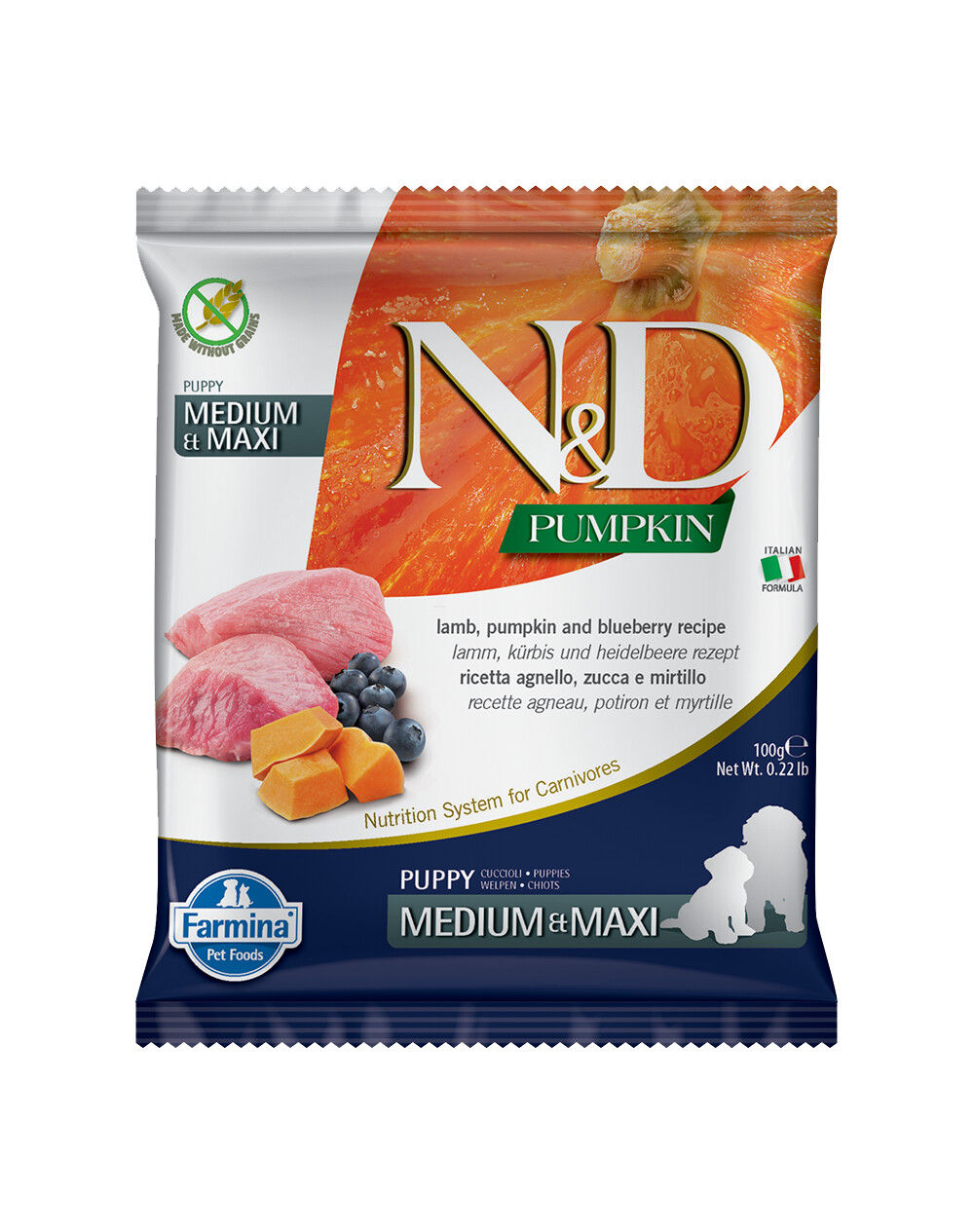 Kompletní krmivo pro štěňata a březí nebo kojící feny, jehněčí, dýně a borůvky.