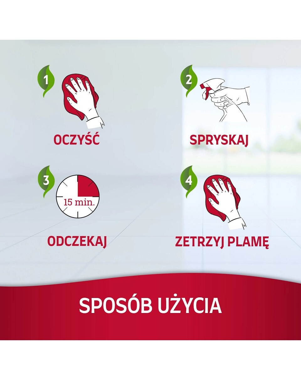 Odstraňovač skvrn a zápachu: vyčistěte skvrnu, jak nejlépe umíte, a poté znečištěné místo důkladně namočte přípravkem. Namáčení je důležité, protože tak přípravek pronikne hlouběji. Nechte působit 15 minut a poté skvrnu vysušte čistým hadříkem.