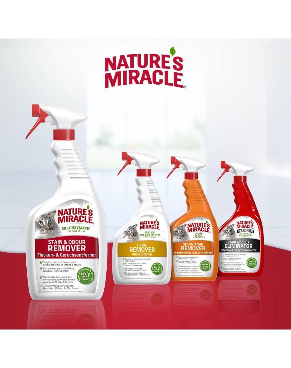 Nature's Miracle® Odstraňovač skvrn a zápachu je navržen tak, aby snadno odstranil každodenní skvrny od koček. Bio-enzymatické složení na bázi bakterií produkuje enzymy, které odstraňují organické skvrny, a působí tak dlouho, dokud nejsou skvrny a zápach odstraněny