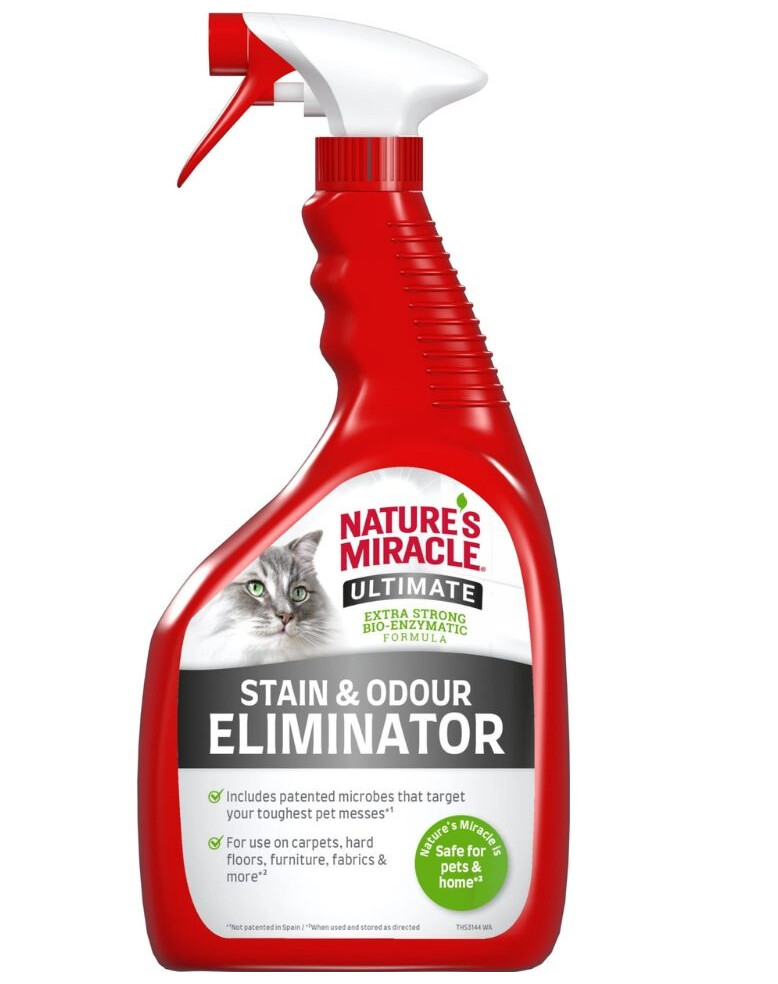 NATURE'S MIRACLE ULTIMATE Stain & Odour Remover Cat je účinný odstraňovač odolné špíny po kočkách. Jeho vylepšené bioenzymatické složení obsahuje patentované mikroorganismy, které bojují i s těmi nejodolnějšími skvrnami, jako jsou moč, výkaly a zvratky. Tento přípravek také neutralizuje nepříjemné pachy, které kočky zanechávají. Lze jej použít na koberce, podlahy, nábytek, tkaniny a další. Důležité je, že je bezpečný jak pro domácí zvířata, tak pro domácnost. Navíc má díky své lehké a svěží vůni osvěžující účinek.