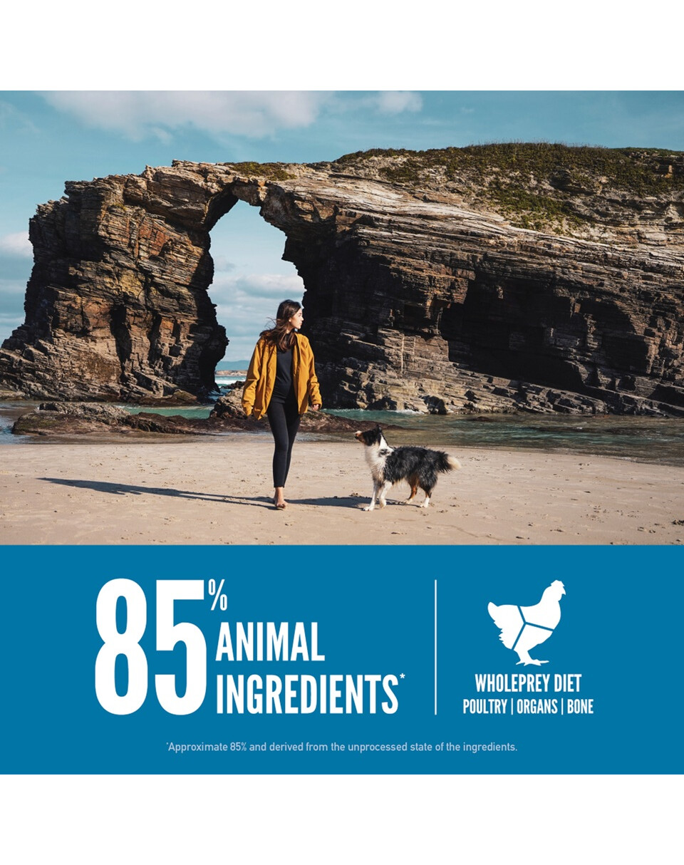 Složení: Čerstvé celé sardinky (18%), čerstvé celé makrely (13%), čerstvé celé štikozubce (12%), čerstvé celé platýze (5%), čerstvé celé červené okouny (5%), čerstvé celé soli (5%), celé makrela (dehydratovaná, 5%), celý sleď (dehydrovaný, 5%), celá treska obecná (dehydratovaná, 4,5%), celé sardinky (dehydratované, 4,5%), celá borůvka (dehydrovaná, 4%), sledě (4%), celá červená čočka, celá zelená čočka, celý zelený hrášek, čočková vláknina, celý cizrna, celý žlutý hrášek, slunečnicový olej (lisovaný za studena), celá pinto fazole, tresčí játra (lyofilizovaná), čerstvá celá dýně, čerstvá celá ořešák, čerstvá celá cuketa, čerstvá celá pastinák, čerstvá mrkev, čerstvá celá lahodná jablka, čerstvá celá bartlett hrušky, čerstvá kapusta, čerstvý špenát, čerstvé řepné listy, čerstvé řepné listy, hnědá řasa, celé brusinky, celé borůvky, celé bobule saskatoonu, čekanka kořen, kurkuma, ostropestřec mariánský, kořen lopuchu, květ levandule, kořen marshmallow Skiego, šípky. DOPLŇKOVÉ LÁTKY (na kg): Zinek: 100 mg; Měď: 11 mg; Zootechnické doplňkové látky: Enterococcus faecium NCIMB10415: 600x10 ^ 6 CFU.