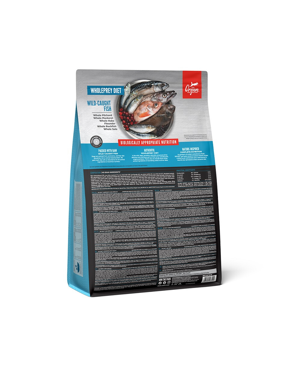 ORIJEN SIX FISH má bezkonkurenční obsah udržitelně ulovených ryb v krystalických vodách severního Pacifiku. Jsou dodávány vcelku, čerstvé a plné nutriční hodnoty. Oceněný ORIJEN je hrdě připravován v kuchyních NorthStar®, aby byl váš pes zdravý, silný a šťastný. Jeho složení je 85% ryb, 15% zeleniny a ovoce.
